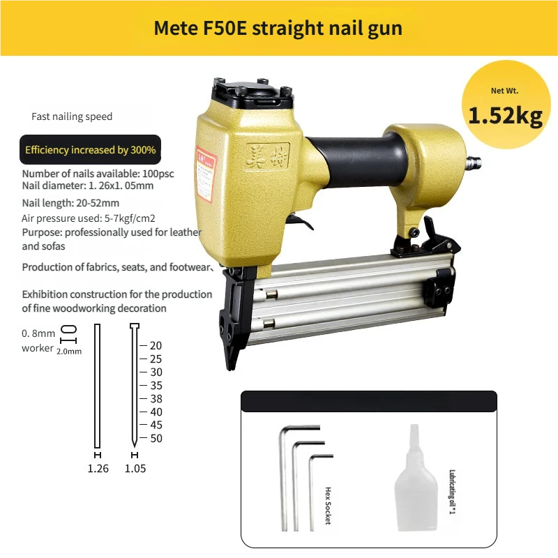 The Meite F50E Long Brad Nailer is a professional pneumatic fastening tool engineered for demanding production environments. Whether you’re working with leather, sofa fabric, chairs, footwear, fine woodwork, exhibition booth construction, this nailer delivers precision, speed, and reliability in every shot.