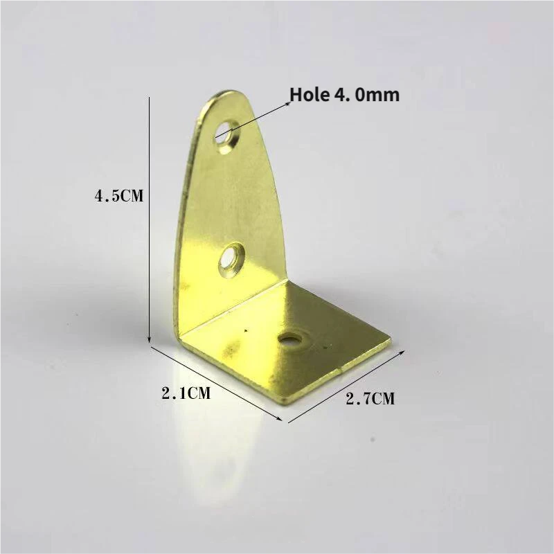 A compact gold-tone L-bracket for lightweight shelves, decorative ledges, and framed display panels where a minimal, low-profile bracket is preferred.