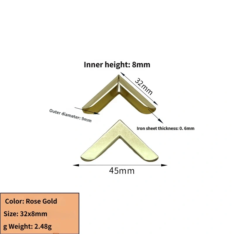 The 1130# Rose Gold Book Corner Guard (32x8mm) combines robust 0.6mm iron sheet construction with a warm rose gold electroplated finish. Designed for premium journals, wedding albums, and decorative frames, this corner guard offers both structural protection and upscale visual appeal. Its 8mm inner channel accommodates thick board covers, and the 45mm total width ensures a secure, symmetrical fit on standard hardcover corners.