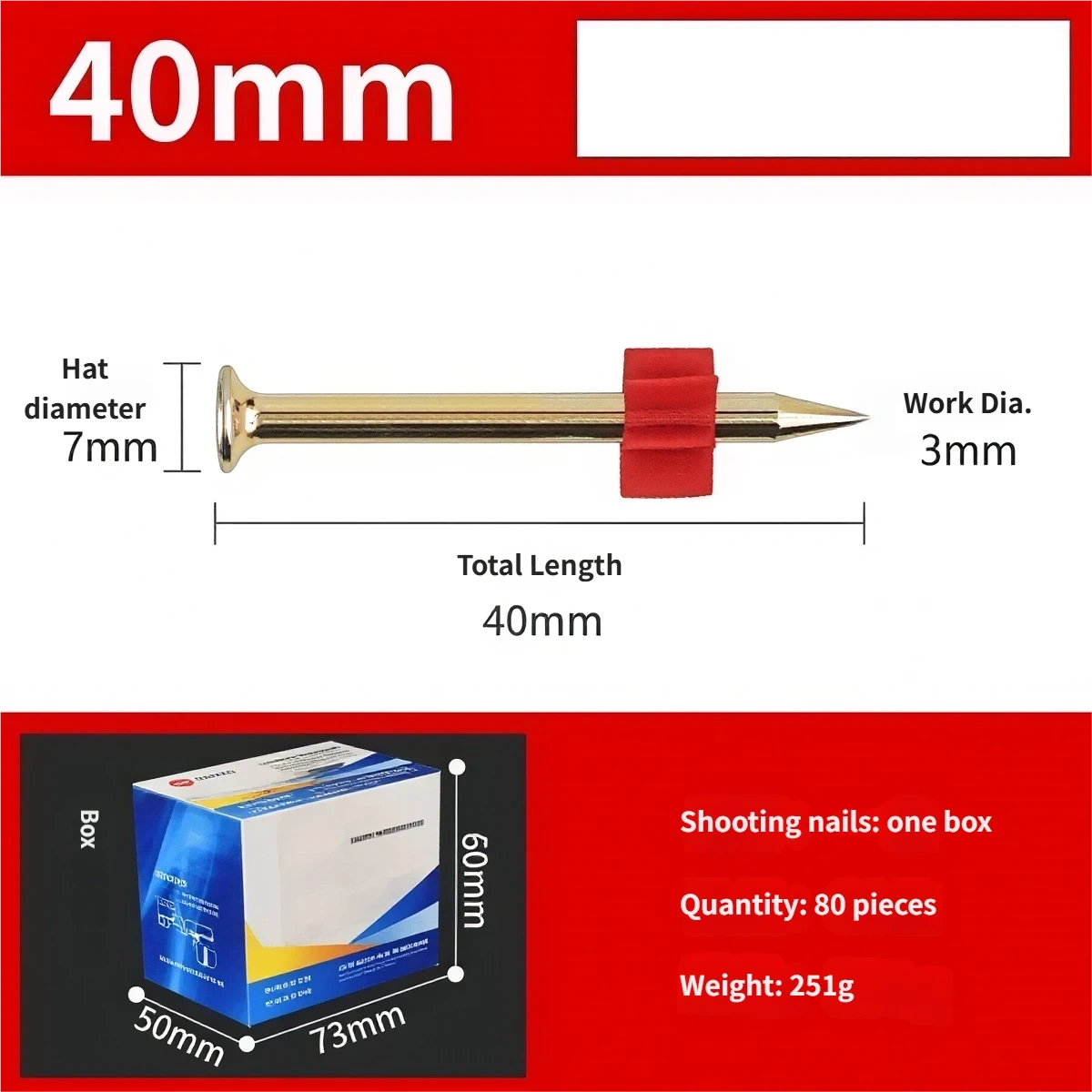 The 40mm Powder Actuated Fastener Nail is available in a box quantity of 80 pieces, with a total package weight of 251g. This bulk-friendly format reduces downtime on high-volume projects and ensures you always have the right fastener to hand.