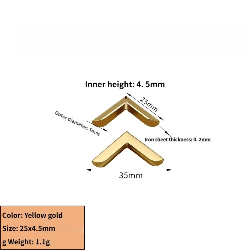 The 1038 Small Sips# Yellow Gold Corner Cap (25×4.5mm) is purpose-built for ultra-thin applications such as slim planners, passport holders, and thin-board notebooks. At just 1.1g per piece, it adds virtually no weight while delivering elegant gold corner accents. The 4.5mm inner height fits very thin covers, and the 5mm outer diameter gives a delicate, refined profile that suits minimalist and premium stationery designs.