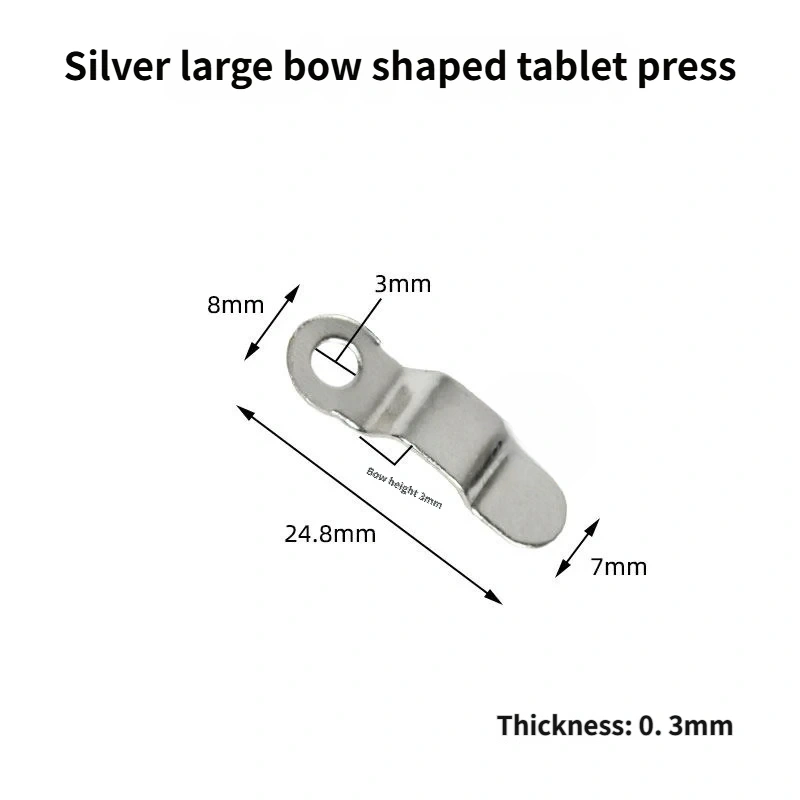 Total length: 24.8 mm. Head width: 8 mm. Tail width: 7 mm. Hole diameter: 3 mm. Thickness: 0.3 mm. Arch height: 3 mm.